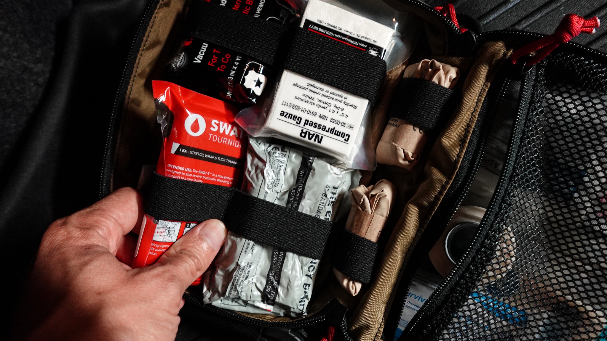 The carefully designed pouch lays out all of the medical components in a clear manner, allowing rapid access to the trauma supplies and a mesh pouch for all of the first aid items. A sleeved pocket behind the elastic webbing holds big flat items like chest seals and splints. We left ample room to add extra medical supplies for your personal needs.