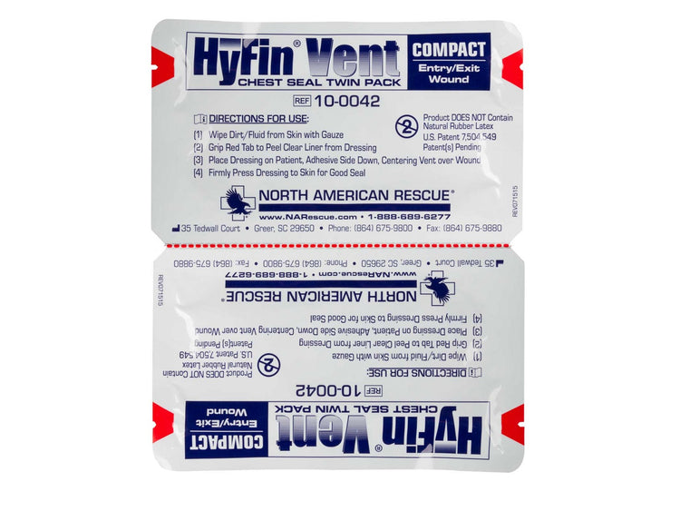 The HyFin Vent Compact Chest Seal Twin Pack provides users with two vented chest seals in a compact packaging for the treatment of penetrating injuries to the chest. Designed with 3-vented channels that allow air to escape the chest cavity during exhalation but prevents airflow from entering through the injury site during inhalation. Each HyFin Vent Compact Chest Seal is 4.75 in. x 4.75 in. and made with advanced adhesive to provide a superior adhesion in the most adverse conditions, including sweaty or hairy casualties.